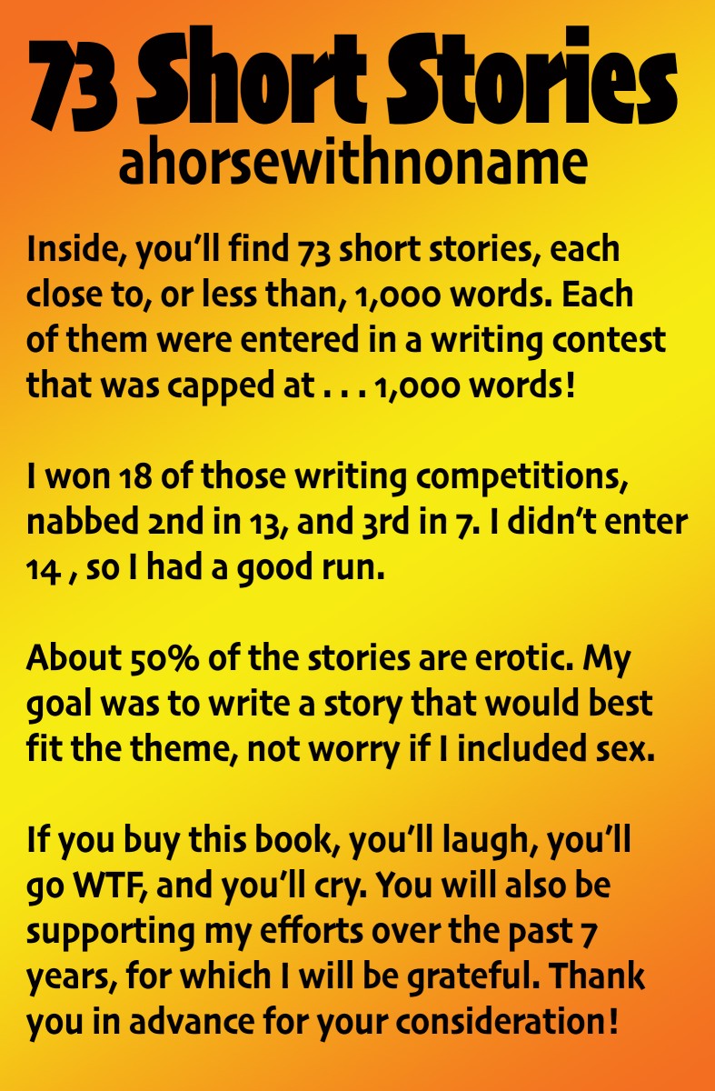 Over the past 7 years, I've written 73 short stories for writing competitions, having placed (1st/2nd/3rd) in 39 of them. About half are erotic. They are ALL at or under 1,000 words, as that was a rule. So, a bunch of short stories that will make you laugh, make you cry, make you go WTF? Hard to go wrong with this many short stories for just a few bucks.
